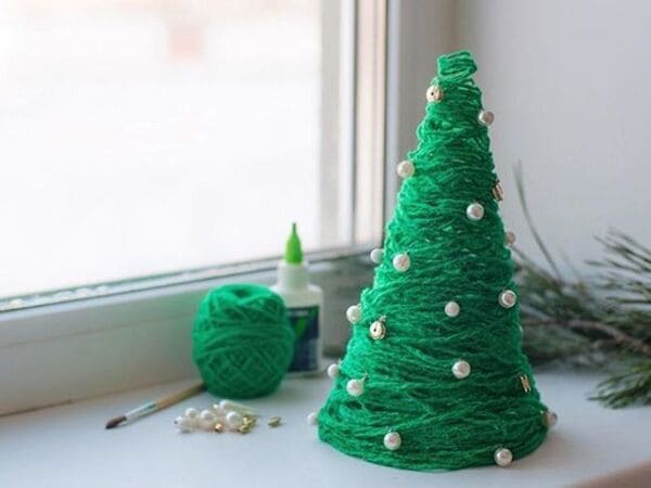 Ялинку з кольорового паперу роблять, згорнувши аркуш у конус та фіксуючи його клеєм. Потім заготовку доповнюють наклеюванням окремих деталей – намистин, шматочків фольги або тканини.